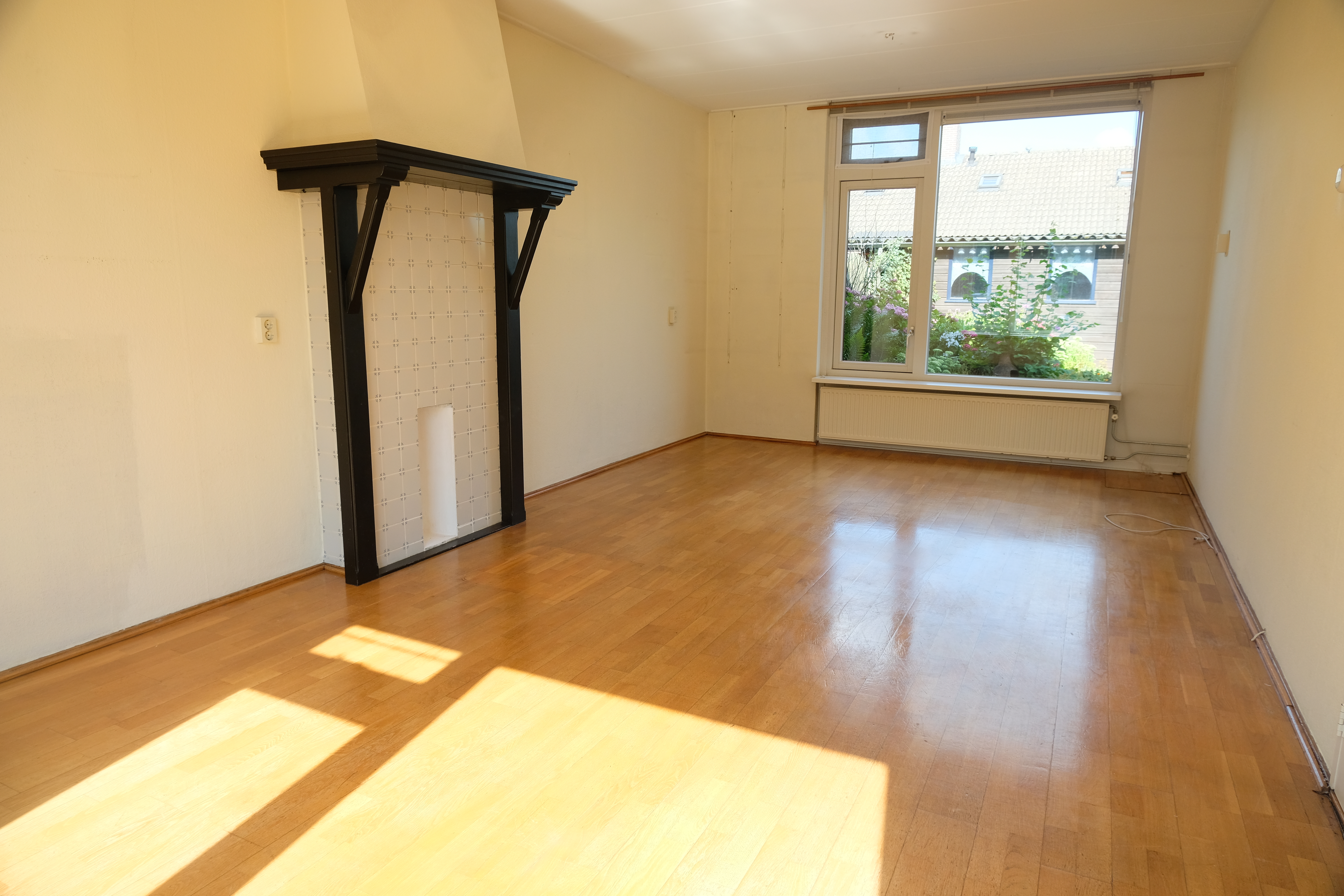 Entree; hal met toilet en trapkast; woonkamer; keuken met deur naar de tuin.
