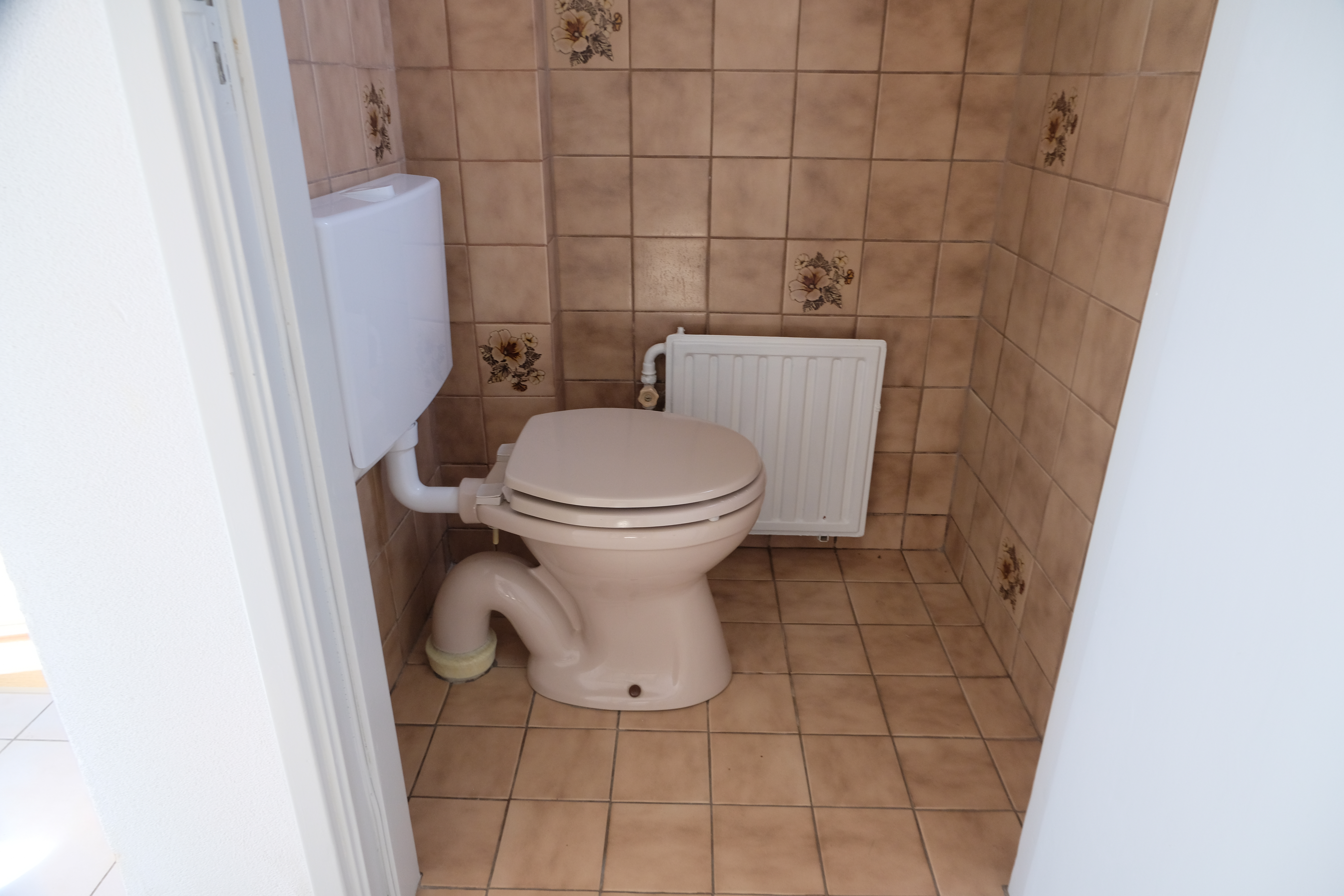 Entree; hal met meterkast; woonkamer keuken met deur naar de tuin; toilet.