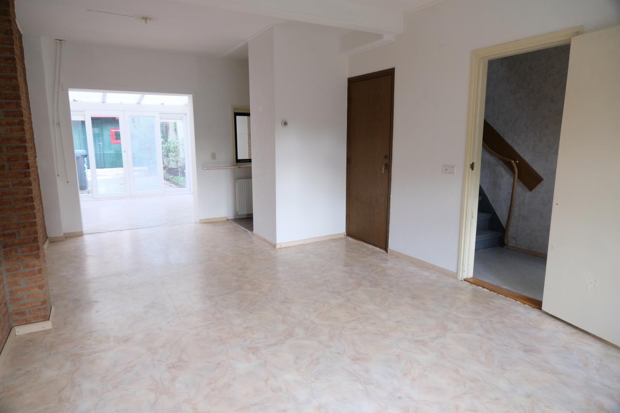 Entree; hal met meterkast; woonkamer; open keuken; uitbouw met schuifpui naar de tuin; aanbouw met toilet en ligbad.