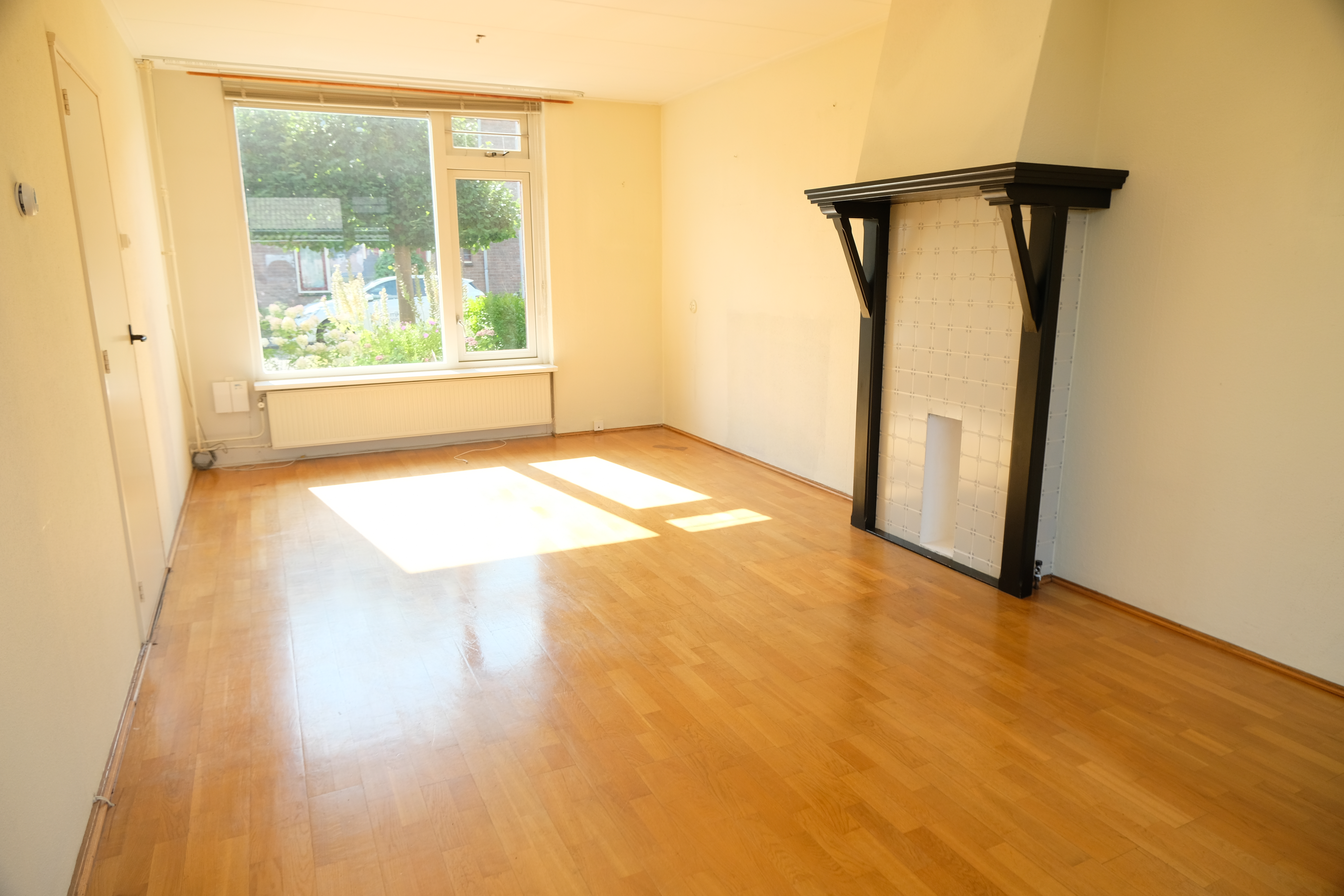 Entree; hal met toilet en trapkast; woonkamer; keuken met deur naar de tuin.